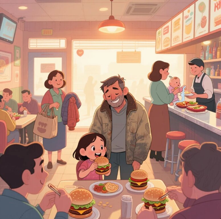 Bỗng có một người đàn ông bước vào cùng cô con gái nhỏ. Gia cảnh khó khăn, nên ông chỉ đủ tiền mua một chiếc bánh mì hamburger cho con.