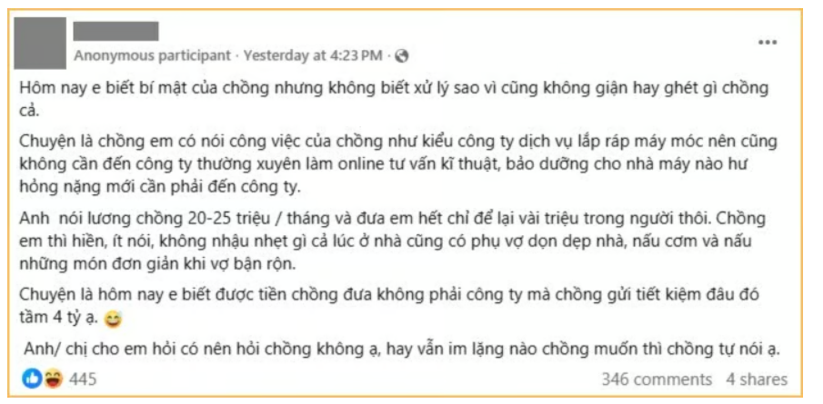 Theo lời kể, chồng cô hầu hết ở nhà. Mỗi lần được hỏi, anh đều giải thích do tính chất công việc không cần lên công ty. Mỗi tháng anh bảo lương khoảng 20–25 triệu, và đều đặn đưa gần hết cho vợ, chỉ giữ vài triệu tiêu vặt. Mọi chuyện tưởng bình thường cho đến khi cô vợ tình cờ biết được bí mật: số tiền anh đưa hàng tháng không phải lương, mà lấy từ khoản tiết kiệm riêng hơn 4 tỷ đồng.