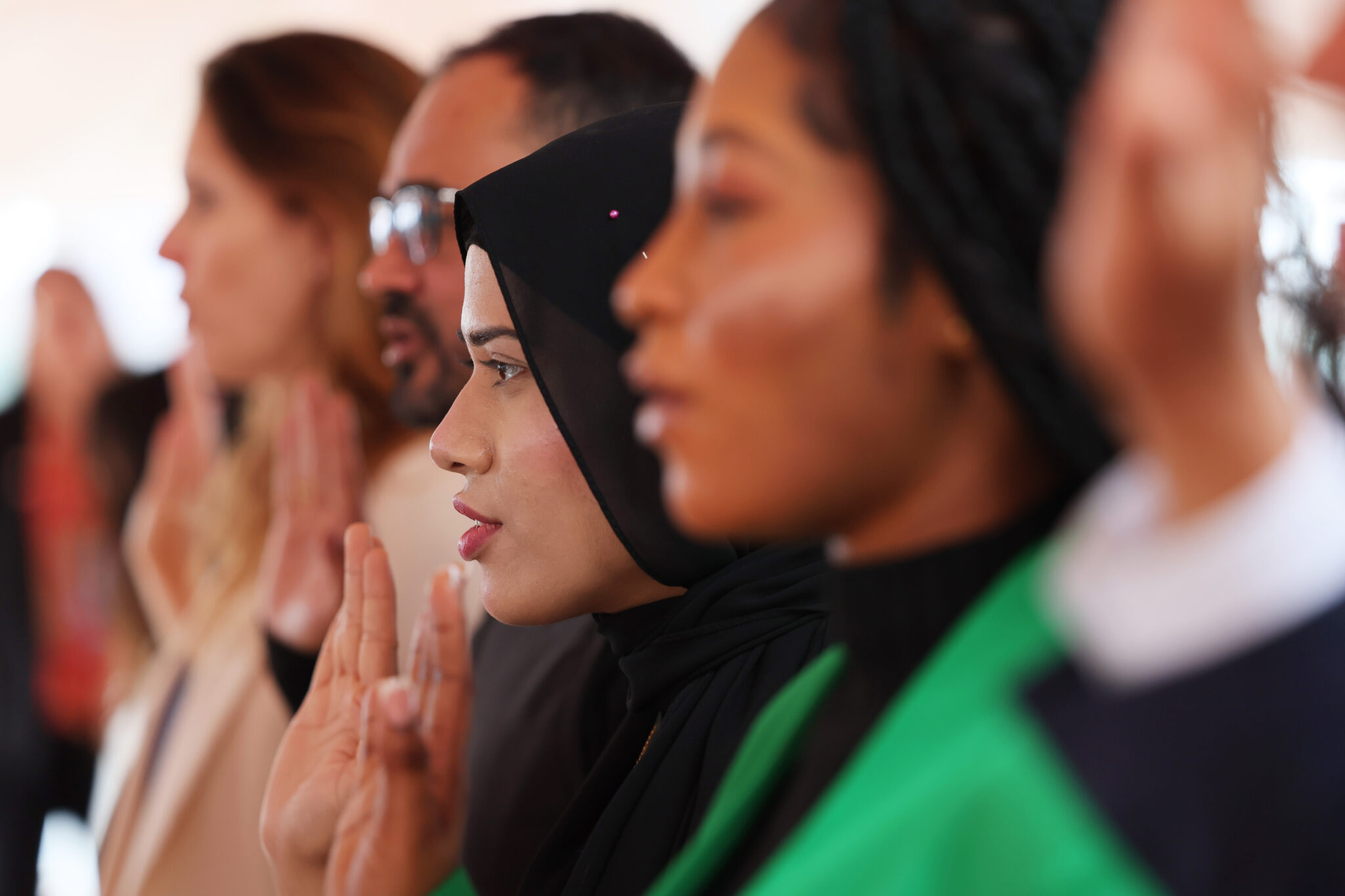 Di dân giơ tay để tuyên thệ trong buổi lễ nhập quốc tịch ở New York hồi năm 2023. (Ảnh: Michael M. Santiago/Getty Images)