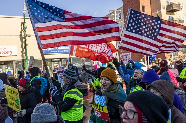 Người biểu tình tuần hành trong điều kiện giá rét, với nhiệt độ gần âm 12 độ C, tại một khu dân cư ở bang Minnesota nhằm phản đối chính phủ trấn áp nhập cư