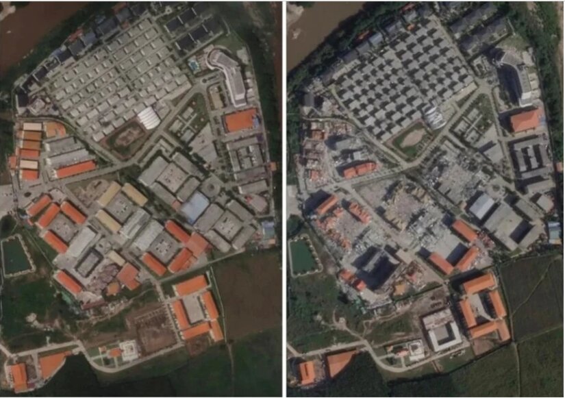 Ảnh vệ tinh cho thấy nhiều trại lừa đảo nằm dọc biên giới Myanmar giáp với Thái Lan đã bị phá dỡ. Ảnh: PBS.
