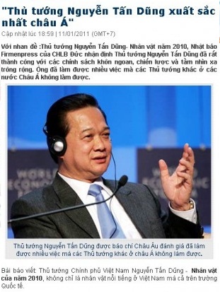 Ngày 11/01/2011, tờ Pháp Luật Việt Nam tung ra bài báo dài gần 600 chữ, “Thủ tướng Nguyễn Tấn Dũng xuất sắc nhất châu Á”, do một người kư tên Phượng Lê viết “theo báo Firmenpress” [sic].