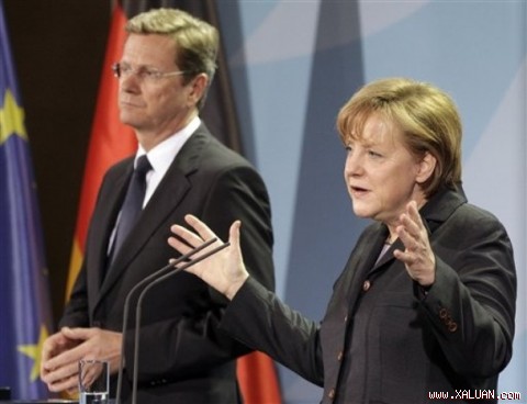 Thủ tướng Đức Angela Merkel (phải) và Phó Thủ tướng Guido Westerwelle tại cuộc họp báo ở Berlin. Bà Merkel cho biết Đức sẽ kiểm tra lại toàn bộ 17 nhà máy điện hạt nhân ở nước này sau các sự c