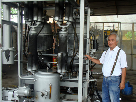 Ông Khánh cũng chế tạo thành công máy nấu sắn thành “xăng sinh học”. Đó là chiếc máy mà chỉ việc đổ sắn vào đầu này, máy sẽ vận hành, đầu kia cho ra cồn nguyên chất.