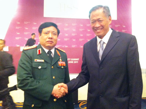 Bộ trưởng Quốc phòng Singapore Ng Eng Hen chúc mừng sau bài phát biểu và trả lời của đại tướng Phùng Quang Thanh - Ảnh: Thục Minh |