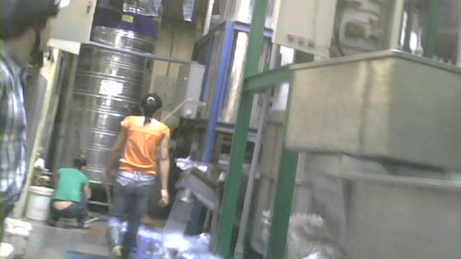 Từ ngoài vào, nền nhà xưởng nhớp nháp nước, một bên là các giàn lọc, máy làm đá, một bên bày ngổn ngang các loại thùng nhựa, bao nilon, giày dép bẩn. Ngay trên nóc các giàn máy lọc nước, làm đá, quần áo của công nhân phơi lủng lẳng. Đúng lúc ra đá, gần chục công nhân cả nam lẫn nữ vây quanh máy không có trang phục theo quy định.