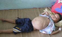 Cậu bé mê mệt đến lịm người nên không nói không cười, chỉ nằm yên một chỗ ngước mắt nhìn. Ai qua lại cũng thương cho quả cam hay cái bánh, lúc này mắt em long lanh đến lạ nhưng rồi lại vội cụp xuống. Chúng tôi để ý thấy mắt cậu bé đỏ hoe như chực bật khóc, dường như em muốn nói lời cám ơn nhưng đành bất lực vì không đủ sức.
