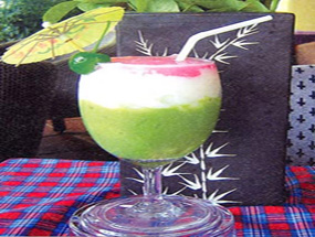 Từ chỗ ngồi, có thể nhìn thấy rõ đống hoa quả mà chị xách về từ chợ vẫn được để ngổn ngang trong góc. Chị nhanh nhẹn mở tủ bảo ôn, lấy ra một hộp đựng mãng cầu và múc từng thìa cho vào máy xay sinh tố, sau đó đổ rất nhiều đường, sữa và một ít nước gì đó trong trong vào (có thể là tinh dầu) rồi bắt đầu xay.. Sau khi xay xong, chị đổ ra cốc, trang trí thêm một chút rồi bưng ra cho chúng tôi. Phải công nhận một điều là trông cốc sinh tố rất đẹp mắt và hấp dẫn.