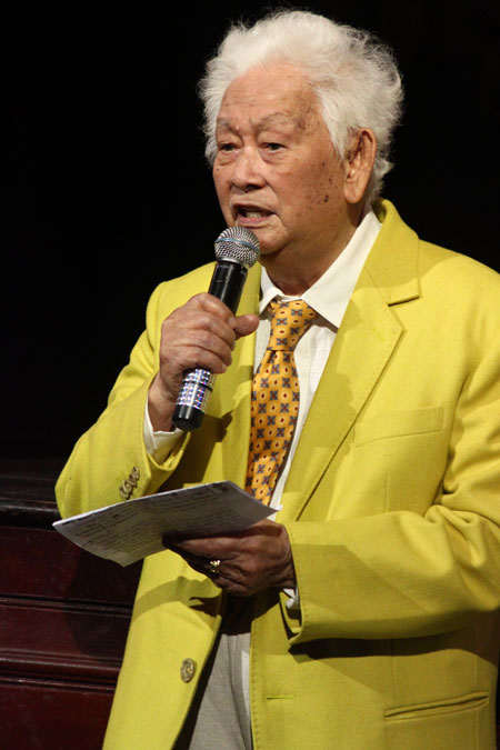 91 tuổi, Phạm Duy vẫn vô cùng lịch thiệp với phụ nữ. Ông cúi đầu nghiêng ḿnh nhận hoa từ người hâm mộ trong đêm "Phạm Duy - Người phiêu lăng".