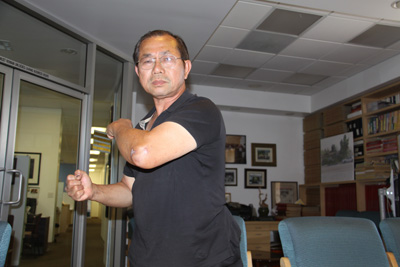 Mặc dù đã giằng co rất quyết liệt với bọn cướp có súng, ông David Ðoàn vẫn khuyên người khác đừng làm như ông. (Hình: Ngọc Lan/Người Việt)