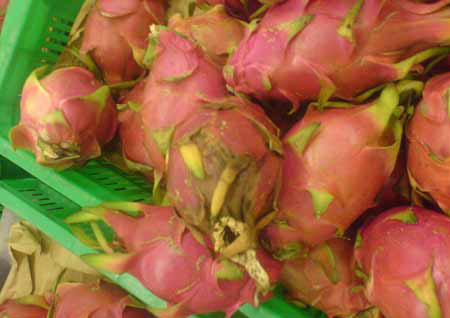 | Thanh Long ruột đỏ bị thối vẫn nằm trên sạp hàng. |