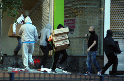 Ðoạn video của CCTV quay một vài khu vực bị cướp phá cho thấy các nhóm băng đảng đang chuyển đi hàng hóa mới chôm được. Họ che mặt bằng khăn của nhóm mình, đầu đội nón chơi bóng chầy kể cả mặc áo có nón trùm đầu.