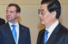 Chủ tịch Trung Quốc Hồ Cẩm Đào (phải) gặp Tổng thống Nga trong chuyến thăm Nga hồi tháng 6.