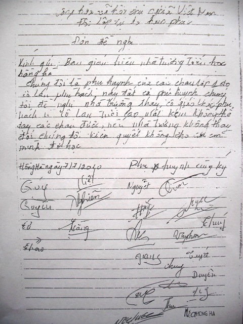 Kết thúc đơn đề nghị là 24 chữ ký của phụ huynh. Điều đặc biệt, tất cả những chữ ký này đều không ghi họ và tên kèm theo.