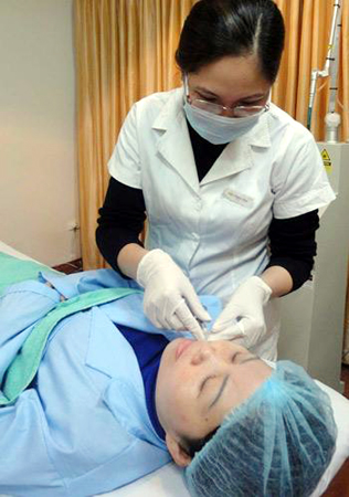 Nhân viên thẩm mỹ tư vấn: "Về nguyên tắc, thuốc được cấy nhẹ vào lớp biểu bì ngoài da giúp đen máu, nuôi da làm cho da căng bóng và đuôi mắt không nhăn hằn nếp khi cười, quý khách sẽ tự tin và an toàn. Thời gian thải trừ thuốc ngắn nên không để lại hậu quả vón cục hay chảy bám vào mô cơ như silicon".