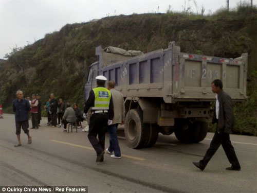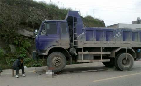 Mẹ của bé Xiong Maoke đau khổ ngồi cạnh chiếc xe tải đã giết chết con mình