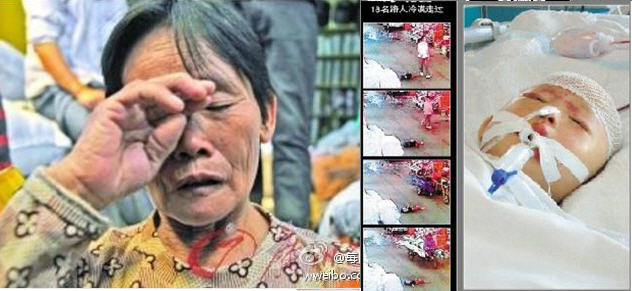 YueYue đã ra đi vào ngày 22 tháng Mười, nhưng tai nạn xảy ra cho em là vào ngày 13 tháng Mười khi hai chiếc xe tải lần lượt cán qua người em, và không dừng lại để cứu giúp. Còn tệ hơn vậy, không một ai trong số 18 người đi ngang qua, đã dừng lại để cứu giúp hay đem em vô chỗ an toàn. Sự vô tâm và coi thường mạng sống của những người nầy đã làm dấy lên một làn sóng phẫn nộ khắp thế giới, nhưng nhiều nhất là ở tại Trung Quốc. Trang mạng Sina Weibo, tương tự như Twitter, đã có hơn 45 triệu ý kiến đóng góp cho sự kiện nầy, và nói chung là nhiều người đã rất phẫn nộ vì tình trạng đạo đức suy đồi mà điển hình là sự nhẫn tâm làm ngơ của những người qua lại trước tình trạng một em bé hai tuổi đang nằm đau đớn với máu me và tiếng khóc vô vọng như vậy. Họ phẫn nộ vì thương cảm cho em bé, hay phẫn nộ vì chính họ đang phải sống trong một xã hội mà đạo đức và lương tâm không còn chỗ đứng?