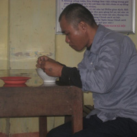 Pẩu được ăn mì tôm tại trụ sở xã Đồng Giáp