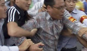 Công an mặc thường phục lẫn lộn trong đoàn biểu tình cũng tham gia đàn áp bắt bớ./RFA file