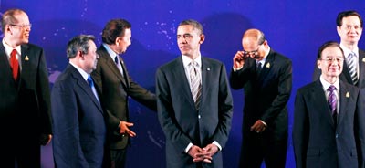Tổng Thống Barack Obama (giữa) đứng chờ trong khi các nhà lãnh đạo khác chuẩn bị đứng vào chụp hình chung trong cuộc Họp Thượng Ðỉnh Ðông Á ở Nusa Dua, trên đảo Bali, Indonesia hôm Thứ Bảy. (Hình: AP Photo/Charles Dharapak)