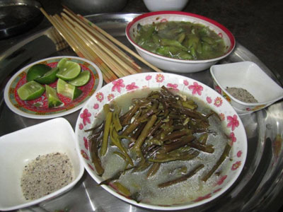 Bữa cơm của người Việt tị nạn chỉ toàn rau và muối. (Hình: Mi Vân)