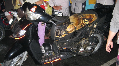 Xe máy bốc cháy khi đang đi chơi Noel