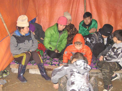 | Vợ con Đoàn Văn Vươn, Đoàn Văn Quư “đón tết” tại căn lều bạt dựng trên nền đất cũ ngoài đầm. |