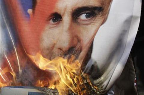 Người biểu tỉnh đốt tấm h́nh in ảnh Tổng thống Syria al-Assad