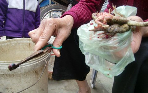Khi chúng tôi bày tỏ muốn tận mắt chứng kiến ông Lộc ăn cóc để kiểm chứng thực hư, bà Dung nhìn lên đồng hồ thấy cũng đã gần trưa, có thể cho chồng dùng “thuốc” nên bà ra một chiếc thùng ở gần giếng bắt lấy 4 con cóc đem ra lấy kéo cắt ngang bụng rồi thoăn thoắt kéo ra những chiếc mật xanh biếc.