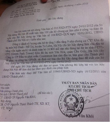 Việc chủ trương lấy quỹ nhà tái định cư bán cho Bộ Xây dựng là có thật. Bởi trong Văn bản số 1618 ngày 12/3/2012 của UBND TP.Hà Nội nêu rơ: UBND TP Hà Nội dành toàn bộ 10.800m2 sàn xây dựng tại dự án nhà ở CT1- CT2 (Green Park Tower) Khu đô thị mới Yên Ḥa, Cầu Giấy, Hà Nội (do Cty Cổ phần Đầu tư phát triển Constrexim làm chủ đầu tư, bàn giao cho TP để phục vụ công tác GPMB, tái định cư) bán toàn bộ cho Bộ Xây dựng theo đề xuất của Sở Xây dựng tại Văn bản số 933/SXD - PTN ngày 24/2/2012.
