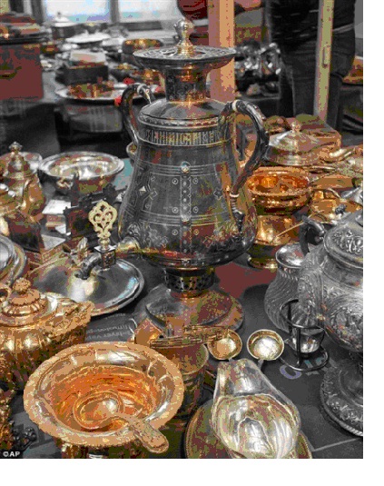 Khi những cái bao nặng trịch được mở nút thắt, hết thảy những người có mặt đều tṛn mắt kinh ngạc : Một kho cổ vật quư giá, nào là tô, chén, đĩa, dao, th́a, nĩa, chân đèn bằng bạc hoặc mạ vàng được chạm khắc cực kỳ tinh xảo.