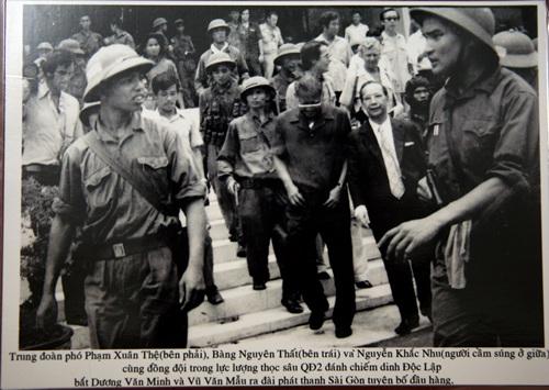 Đồng chí Bàng Nguyên Thất: Không, t́nh huống bắt Dương Văn Minh là tính huống rất bất ngờ v́ chúng tôi được giao nhiệm vụ đơn vị nào vào Dinh Độc Lập trước th́ cắm cờ. Nhưng khi chiếc xe Jeep của chúng tôi vọt lên tiền sảnh đă thấy anh Bùi Quang Thận cầm cờ chạy vào Dinh Độc Lập rồi. Đúng lúc khi chúng tôi tiến vào tiền sảnh Dinh, Chuẩn tướng Nguyễn Hữu Hạnh là Phụ tá của Tổng thống Dương Văn Minh đă đợi sẵn. Nguyễn Hữu Hạnh nói với đồng chí Phạm Xuân Thệ “Báo cáo cấp chỉ huy, Tổng thống Dương Văn Minh và Thủ tướng Vũ Văn Mẫu đang chờ các ông Giải phóng trên lầu để bàn giao.”