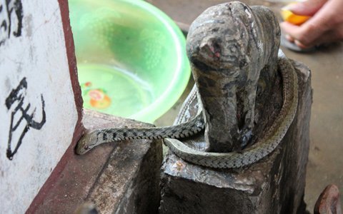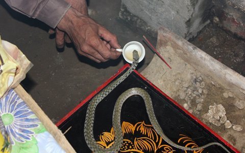 Nhìn vào trong thì thấy một chú bé khoảng chừng 14 tuổi đang ngồi cạnh một con rắn có màu xanh nhạt, dài chừng khoảng 70cm. Sau khi khấn mấy câu nơi cửa miệng, chú bé nhẹ nhàng cầm lấy con rắn, đưa vào chậu nước đã có sẵn để “mời ngài tắm” cho những người có mặt chứng kiến.
