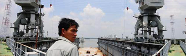 Đầu tháng 5-2012, chúng tôi có mặt tại cảng G̣ Dầu (Phước Thái, Long Thành, Đồng Nai), từ xa đă nh́n thấy ngay một “khối sắt” khổng lồ nằm sừng sững bên cầu cảng. Đó là ụ nổi No83M của Công ty TNHH sửa chữa tàu biển Vinalines (trực thuộc Vinalines). Với hơn 10 công nhân cơ khí được giao nhiệm vụ bảo vệ, ụ nổi này gần như đang để hoang, cơ sở vật chất xuống cấp nghiêm trọng. Đường đi lên ụ là một chiếc cầu phao, mặt cầu làm bằng gỗ đă mục nát, nhiều đoạn phao ch́m dưới mặt nước.