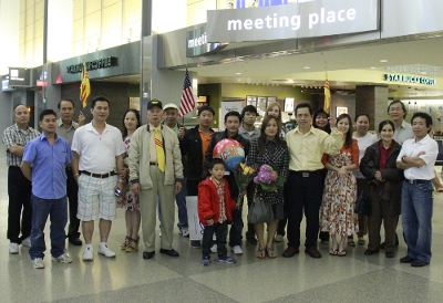 Gia đ́nh ông Nguyễn Hữu Hải (giữa) được đón tiếp tại phi trường Raleigh, North Carolina, hôm 22 Tháng Năm. (H́nh: BPSOS cung cấp)