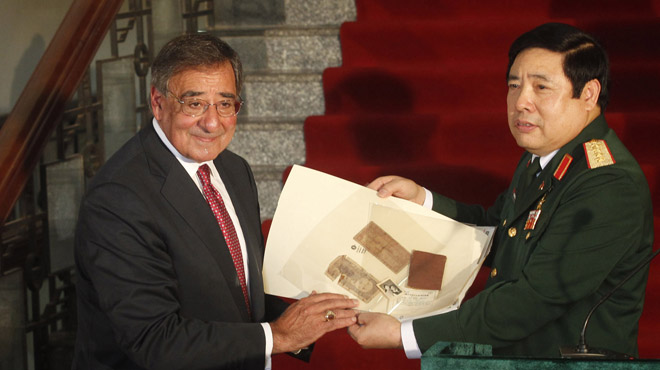 | Bộ trưởng Phùng Quang Thanh đã trao cho Bộ trưởng Leon Panetta ba bức thư, những kỷ vật của lính Mỹ trong chiến tranh ở Việt Nam. Bộ trưởng Panetta cũng trao lại cho Bộ trưởng Phùng Quang Thanh cuốn nhật ký của một quân nhân Việt Nam và bày tỏ hi vọng nó sớm được trở về với gia đình người lính ấy - Ảnh: Huy Khâm |