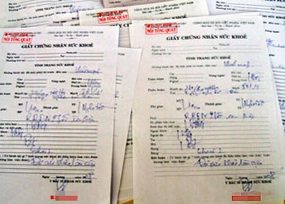 Khi t́m kiếm trên mạng, rất dễ dàng t́m được các đoạn rao vặt kiểu như: “Em nhận làm thêm mảng giấy khám sứcc khỏe cho bạn nào có nhu cầu nhé. Giấy em là dấu tṛn , làm theo mẫu mới nhất khổ A3 của Bộ y tế , không phải khổ A4 mà 1 số cơ quan không chấp nhận đâu nhé. Giấy khám SK do bệnh viện Xây dựng cấp . Alô là có ngay , không cần phải đợi chờ như những nơi khác. Có thể dùng đi xin việc, đi làm, giấy phép lái xe ô tô ,...... Đặc biệt giá cực tốt : 130k/ tờ A3”.