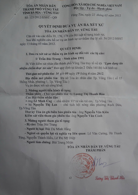Với tư cách là người bị hại, người liên quan mà tòa án nhân dân TP Vũng Tàu triệu tập tôi đến tòa. Sáng ngày 15/6/2012 Tôi đã đến tòa án, viện kiểm sát nhân dân TP Vũng Tàu để xin kết luận điều tra, cáo trạng của vụ án. Nhưng không được cấp, thậm chí khi đến Viện kiểm sát nhân dân TP Vũng Tàu còn không được trả lời rõ ràng là tôi có quyền được có cáo trạng, kết luận hồ sơ để tìm hiểu hay không. Đây là vụ án hình sự, không phải trong trong mục xâm pham an ninh quốc gia, phiên tòa được xử công khai. Tại sao người bị hại, đồng thời là thân nhân ( mẹ đẻ của bị cáo Trần Bùi Trung) không được biết những điều sơ đẳng về việc khởi tố, điều tra, truy tố....? Ông Hồng trưởng phòng xét xử của viện kiểm sát nhân dân TP Vũng Tàu trả lời tôi là “Tôi xin phép không trả lời câu hỏi này”. Tại sao ông Hồng không trả lời câu hỏi về việc xin cáo trạng, kết luận điều tra của tôi? Là người làm luật, đáng ra ông phải có câu trả lời rõ ràng là tôi (người bị hại, người có quyền lợi nghĩa vụ liên quan) có được nhận cáo trạng, kết luận hồ sơ hay không? Nếu không được nhận thì vì lý do gì, quy định gì? Một cán bộ làm đến chức trưởng phòng của viện kiểm sát vì sao không thể trả lời hướng dẫn cho người dân về hiểu biết pháp luật/đang liên quan tới công việc của mình mà trái lại có cách trả lời “ỡm ờ- vô trách nhiệm” có phải gây khó khăn cho người dân (người bị hại, người có nghĩa vụ quyền lợi liên quan), nếu gây khó khăn như vậy thì với ý đồ gì?