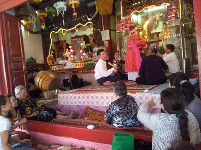 Khá tò mò vì tiếng nhạc, tôi tiến gần đến ngôi đền mà người tài xế kia chỉ. Xung quanh có tới 3 chiếc ô tô 4 chỗ sang trọng đỗ hiên ngang dưới vệ đường. Tiến gần hơn đến trước cửa đền, một bà lão chừng hơn 70 tuổi, cổ đeo vòng hạt, mặc quần the đen, áo hoa văn đứng nhìn tôi với vẻ mặt lạ lẫm.