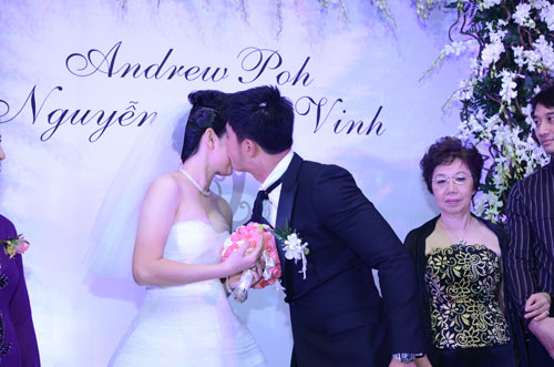 Sau khi tổ chức hôn lễ tại tư gia, cặp đôi di chuyển đến khách sạn Sheraton để chuẩn bị đón khách mời cho tiệc cưới diễn ra vào lúc 19h tối 27/7. Vốn là người kín kẽ, nên khi được chồng thể hiện tình yêu bằng nụ hôn, cựu người mẫu tỏ ra bối rối, e thẹn.