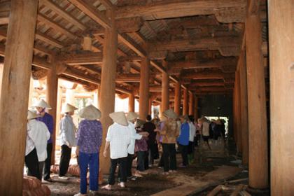 Người ta dỡ trắng, “giải phóng mặt bằng” cả nhà tổ, gác khánh, bỏ toàn bộ cấu kiện cũ, mua gỗ mới, đổ bêtông nền, lát đá - gạch mới toanh, dựng lên một di tích mới trong niềm… “tự hào” của không ít người.