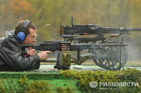 Tại một bãi tập, Thủ tướng Dmitry Medvedev đã trực tiếp thử nghiệm một số loại vũ khí, trong đó có các loại súng trường, súng ngắn và súng máy.
