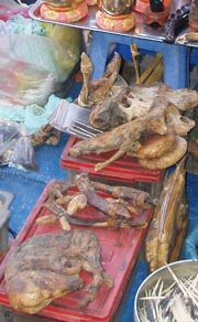 Còn đang choáng trước cảnh khách du lịch người Việt - mà chủ yếu là các bà nô nức đến chợ Cây Tre tậu "thần dược" luyện nội công thì khi đến chợ Chba Om Pau ở quận ngoại thành Miêng Chay - cách trung tâm thủ đô Phnôm Pênh khoảng 7km theo hướng dẫn của một số "tín đồ" tóc dài của hội chứng tráng dương cường âm, chúng tôi xám hồn trước ma trận cao đơn hoàn tán và đặc biệt ấn tượng trước hình ảnh một số người đàn ông bày trên những tấm bạt xương cốt, bào thai của các loại thú hoang.