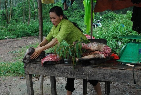 Nép xe vào lề đường, chúng tôi tìm đến một cái lán nhỏ, nơi người ta đang cân đong, đo đếm một cách nhộn nhịp như ở những phiên chợ bình thường khác. Tuy nhiên, điều khác biệt và làm chúng tôi kinh ngạc đó là thứ mà người ta đang mua bán, trao đổi ở đây đều là thịt của những loài động vật quý hiếm. Người phụ nữ trạc tứ tuần nhanh tay giới thiệu với thực khách qua đường, đây là hàng bẫy từ rừng chính gốc, không đúng không lấy tiền. Đưa mắt quan sát một lượt, chúng tôi nhận thấy, rất nhiều hoang thú quý hiếm như mang, nai, rùa, nhím, lợn rừng... đã bị hành quyết.