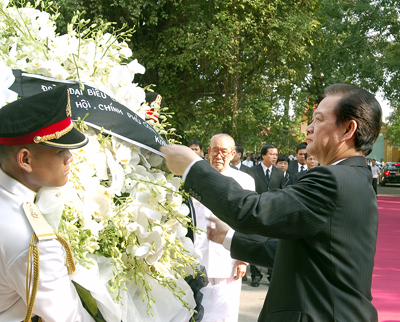 Thủ tướng Nguyễn Tấn Dũng chỉnh Vòng hoa của Đoàn đại biểu cấp cao Việt Nam viếng Thái Thượng hoàng Campuchia Norodom Sihanouk - Ảnh: VGP