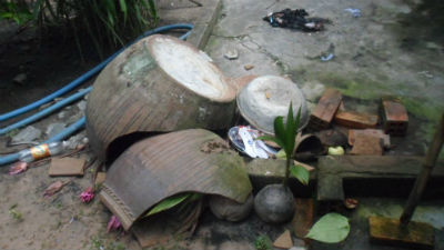 | Chiếc lu nước nơi phát hiện xác em bé đã bị đập bỏ |