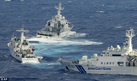 Tuy vậy, khi hành động khẳng định chủ quyền của Trung Quốc khi đã quá mức quy định của Nhật Bản thì Nhật Bản phản ứng rất cứng rắn, không khoan nhượng. Ảnh trên:Tàu Cảnh sát biển Nhật Bản truy đuổi tàu Hải giám Trung Quốc