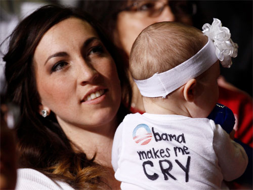 Một người ủng hộ ứng cử viên Đảng Cộng hòa Mitt Romney bế cậu con trai có dòng chữ: "Obama làm tôi khóc"!