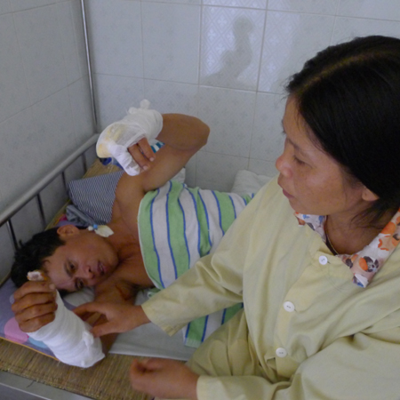 Nói rồi bà lại khóc và nh́n chân tay chồng. Hai tay, hai chân đều được băng bó kín và không c̣n nguyên vẹn… Bà sợ phải cắt bỏ hết đi th́ chắc chồng sẽ không sống nổi bởi “c̣n phải làm việc lấy tiền nuôi con ăn học”. Đúng là cha mẹ nào cũng thương con nhưng t́nh yêu con của người nông dân chân chất này sao khiến người khác nghẹn ḷng đến vậy. Nếu như không c̣n tay chân nữa, bà nào có nghĩ đến nỗi đau của bản thân mà điều duy nhất lo lắng là không c̣n lao động để nuôi con được nữa.
