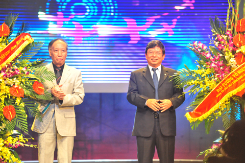 | Ông Phan Hoàng Đức, Phó Tổng giám đốc VNPT (phải) và Trưởng Ban tổ chức Phạm Huy Hoàn đón nhận hai lẵng hoa của đồng chí Trương Tấn Sang - Ủy viên Bộ Chính Trị - Chủ tịch nước và Đại Tướng Vơ Nguyên Giáp.